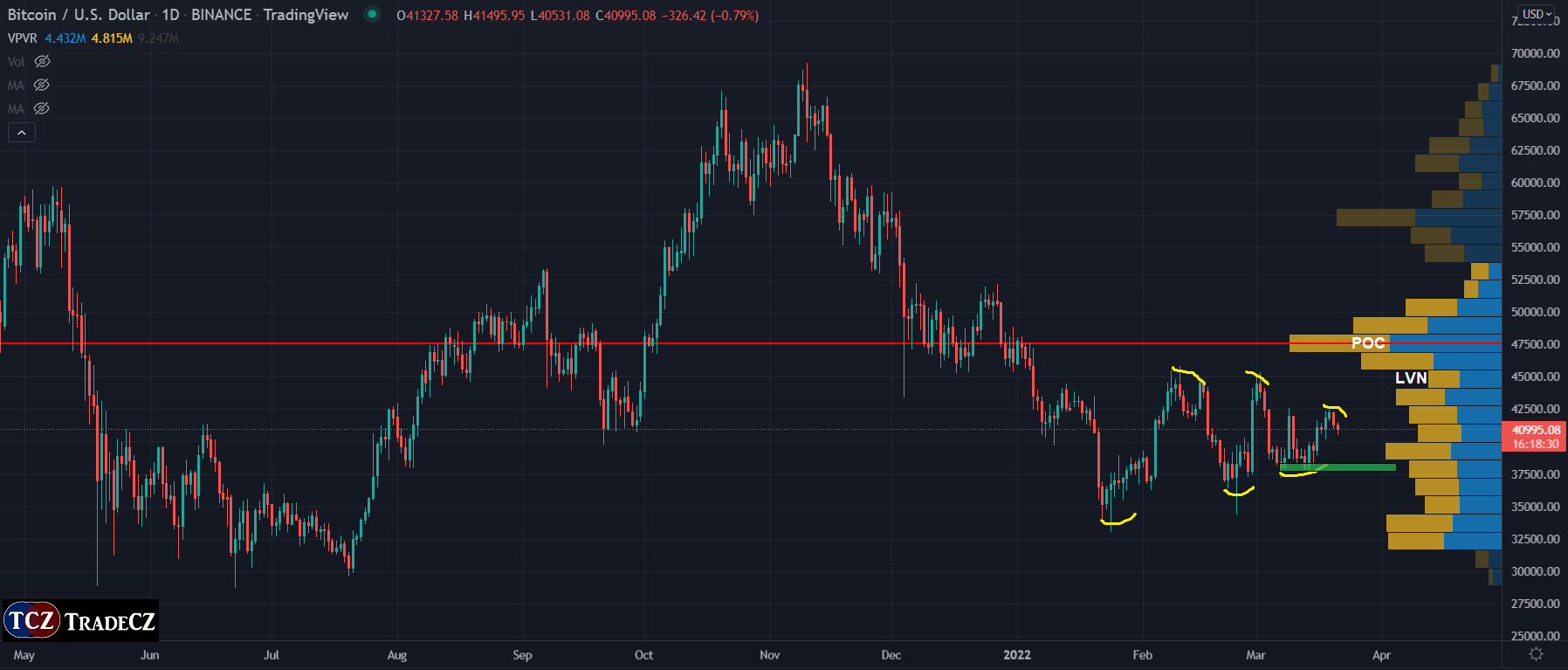 Základní resistancí je cenová oblast kolem 45 000 USD, kde se nachází Low Volume Node (LVN), jež působí jako překážka pro návrat trhu do oblasti hodnoty (POC).