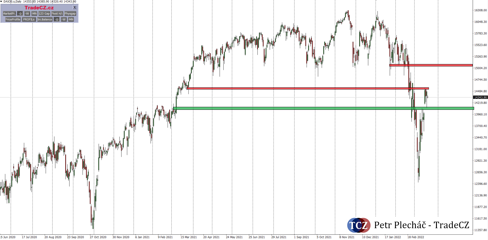 Německý akciový index DAX předvádí učebnicový obrat ve tvaru V. Poté co trh oslabil až na hodnoty kolem 12 500, obchoduje se za dva týdny na cenách kolem 14 500. I v tomto případě se může jednat o volatilní konsolidaci, přičemž další postup indexu k ATH není vůbec zaručen.