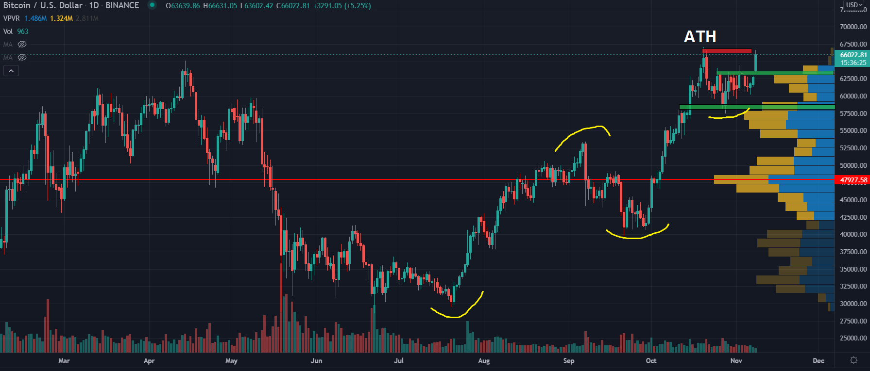 Největší kryptoměna Bitcoin v současné chvíli proráží oblast konolidace High Volume Node a testuje své historické cenové maximum!