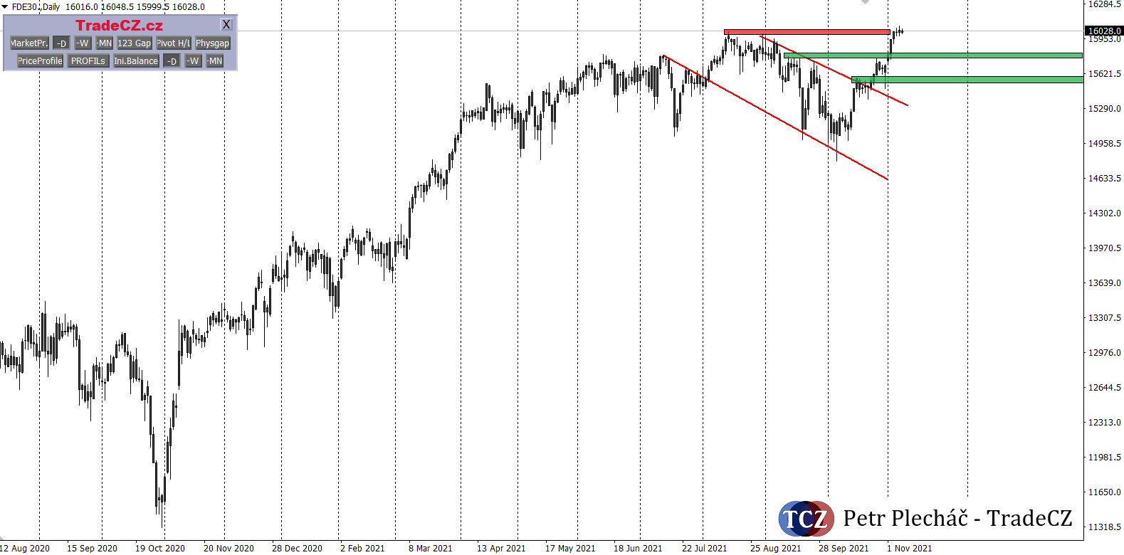 Německý akciový index DAX dokázal po delší době napodobit své slavnější kolegy z USA a stanovit nová historická cenová maxima nad 16 070 b.