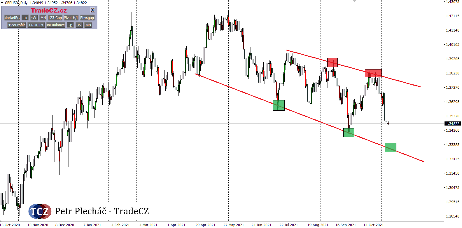 Na měnovém páru GBP/USD jsme byli svědky respektování zakresleného sestupného trendového kanálu. Trh na nižším časovém rámci vytváří nižší swing high a nižší swing low, přičemž v tomto týdnu bude zajímavé sledovat, zda se mu podaří vytvořit nové lokální cenové minimum a případně i reagovat na spodní klesající trendline.
