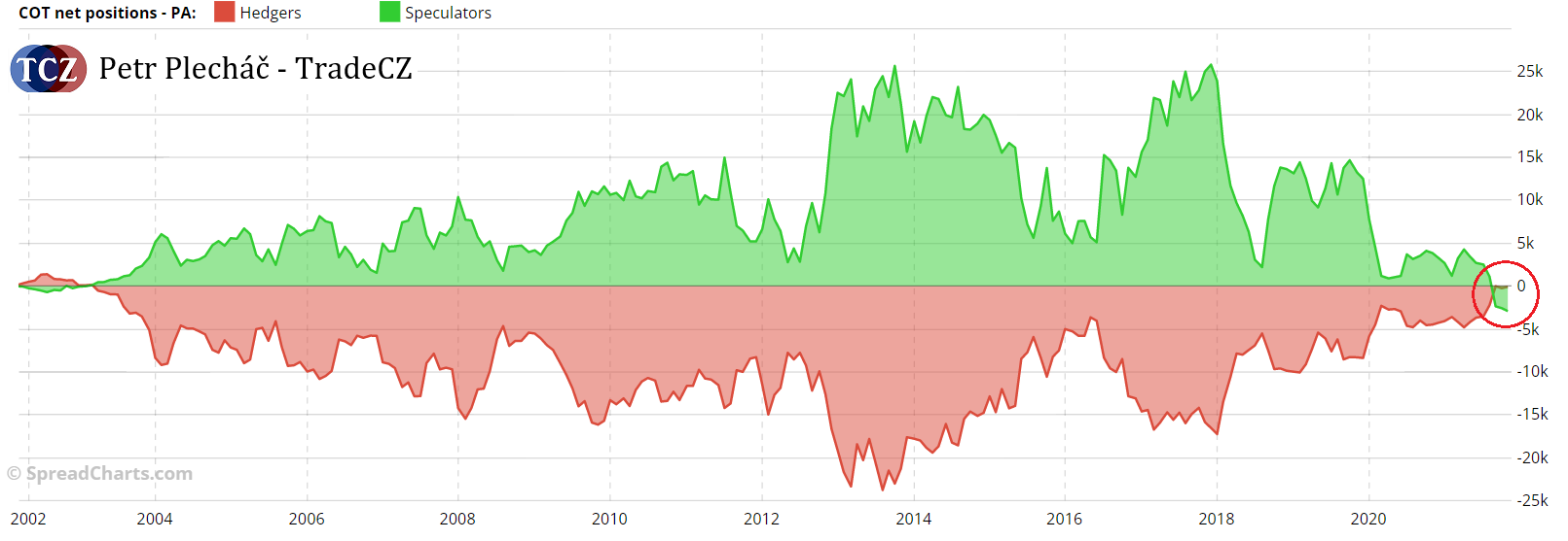 Velcí spekulanti se po dlouhé době dostali do extrémně vyhrocených pozic, tzv. net short, tedy do situace, kdy drží víc shortů než longů. Na čistém cenovém grafu vidíme pattern triangle a přípravu na breakout. COT index nás informuje o přeprodanosti a potenciálním dalším růstu ceny.