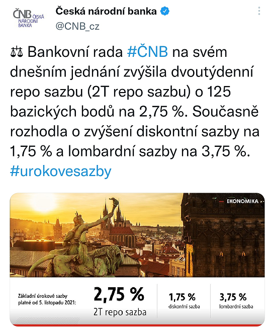 ČNB zvýšila dvoutýdenní repo sazbu o 125 bazických bodů! Ta tedy aktuálně činí 2,75 %.