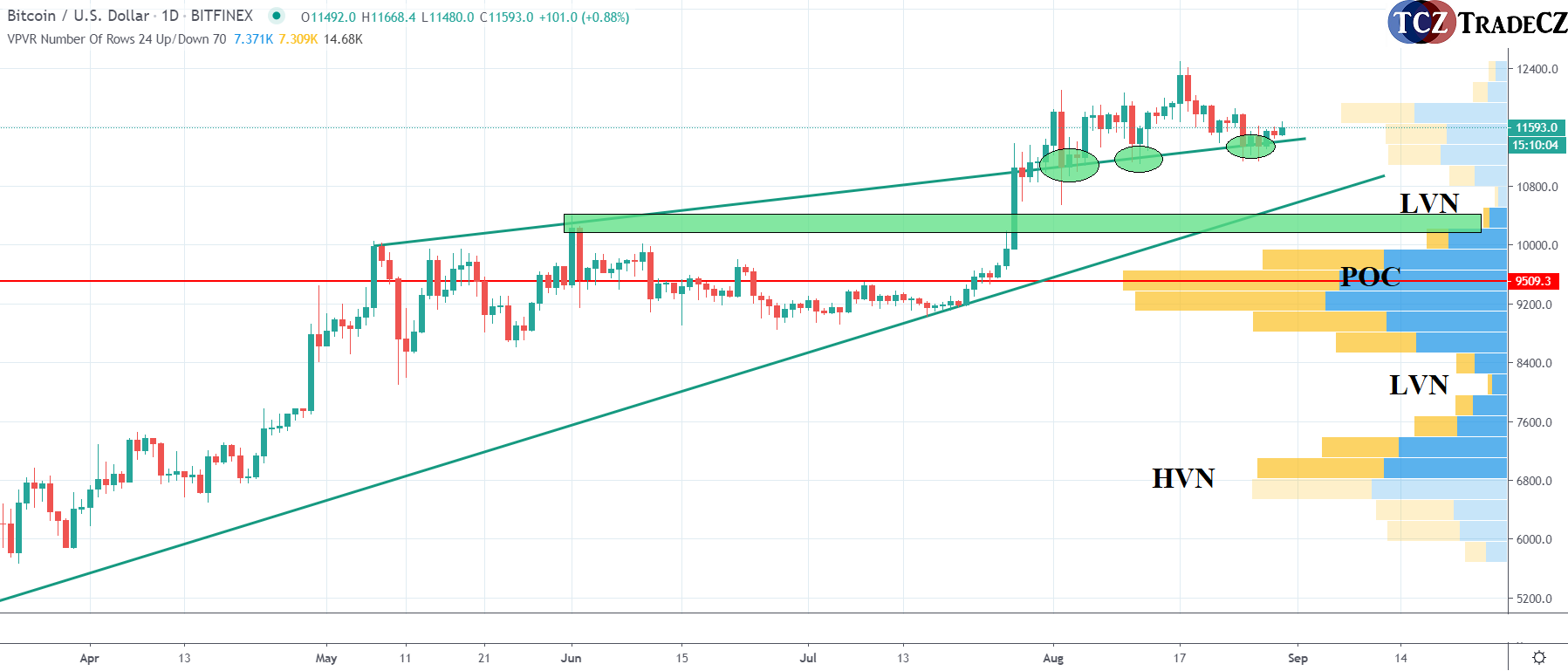 Bitcoin testuje rostoucí trendovou linii, která je jeho poslední záchranou před propadem do oblasti LVN a psychologické hranice 10 000 USD. Trh by měl udržet v rostoucím trendu POC z Volume Profile.