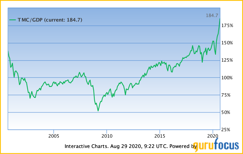 Poměr mezi tržní kapitalizací firem a HDP ve Spojených státech se stále kloní více na stranu rychleji rostoucí kapitalizace oproti zasažené US ekonomice.