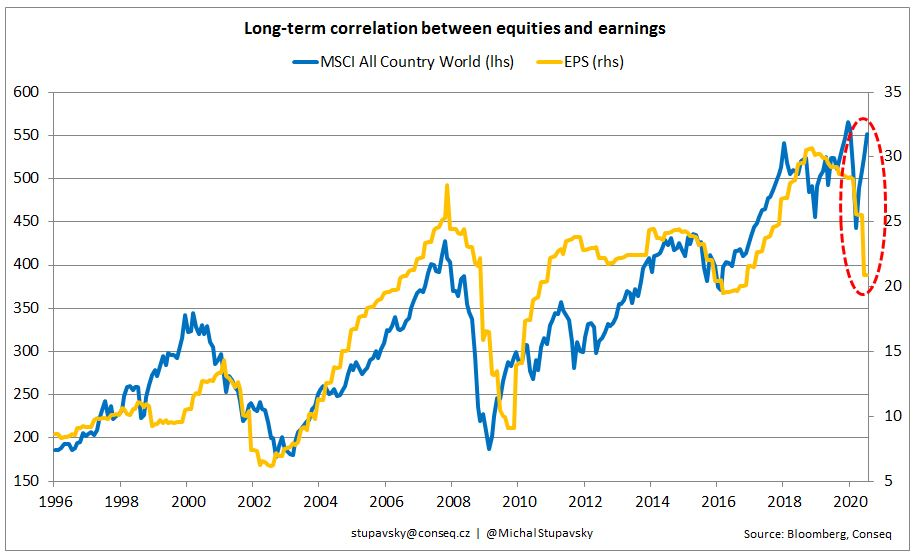 Rozevírající se nůžky mezi EPS (zisk na akciích) a akciovým trhem. Podobné události jsme byli svědky například v roce 2000, v případě bubliny Dot-com.