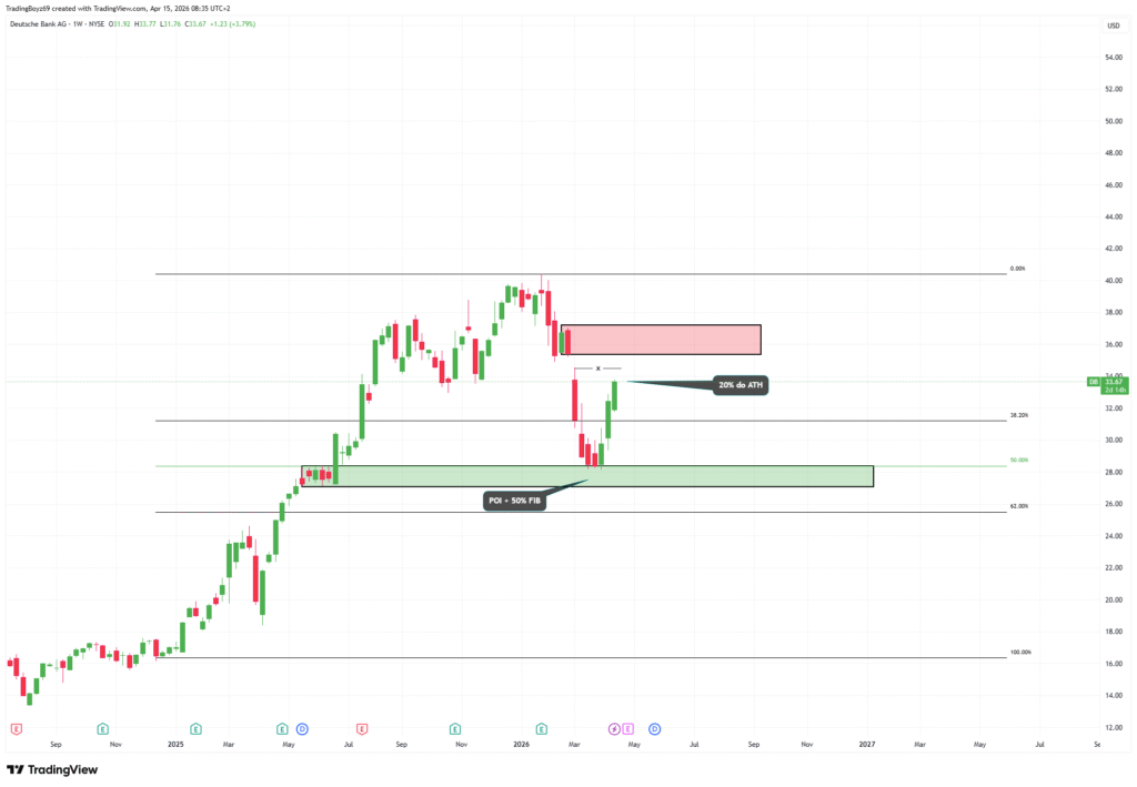 Pár týdnů zpět jsme se dívali na technickou analýzu této banky a z hlediska bankovního sektoru byla cena velmi přijatelná – velké banky totiž typicky tvoří pouze menší pullbacky. V tomto případě jsme měli ideální kombinaci daily demand zóny spolu s 50% Fibo retracementem. Jak nyní vidíme, reakce byla poměrně solidní. Spolu s tím, jak se trh postupně přepíná zpět do režimu risk-on, můžeme očekávat pokračování růstu. Bankovní sektor navíc těží z vyšších úrokových sazeb, které zlepšují úrokové marže (net interest margin), což podporuje pozitivní sentiment. Do ATH nám aktuálně zbývá přibližně 20 %, což stále ponechává zajímavý prostor pro další růst, pokud bude makroekonomické prostředí příznivé.