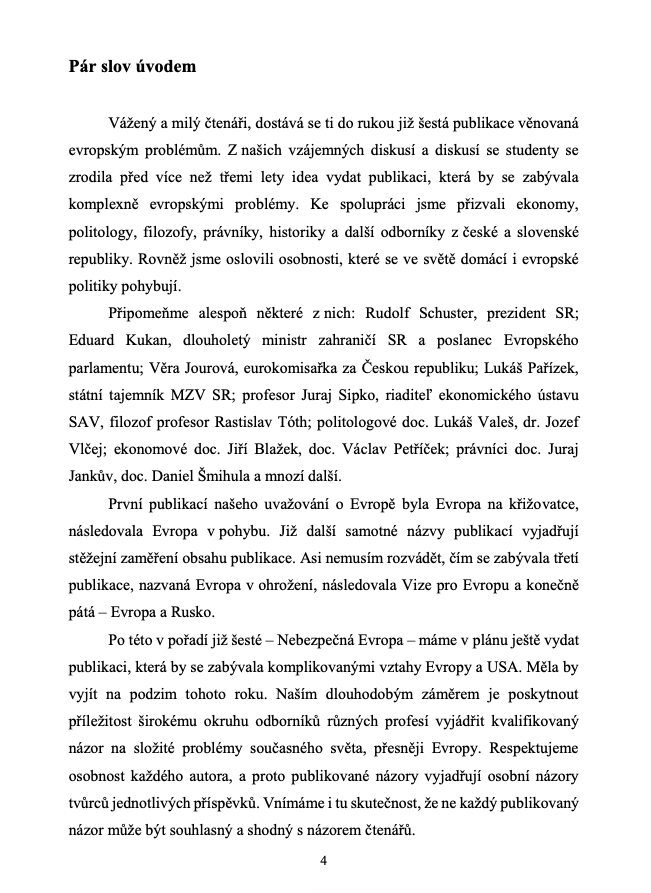 Kniha Nebezpečná Európa se zaměřuje na současné bezpečnostní výzvy v Evropě a zkoumá otázku, zda je Evropa stále bezpečným a stabilním prostorem pro život. Hlavní témata zahrnují: Migrace, koronakrize (COVID-19) a Brexit – jako klíčové kritické jevy, které testují evropskou stabilitu. Kritická reflexe: je Evropa i nadále bezpečným místem? Poskytuje analytický pohled na aktuální hrozby i možnou podobu efektivní a funkční budoucnosti Evropy.