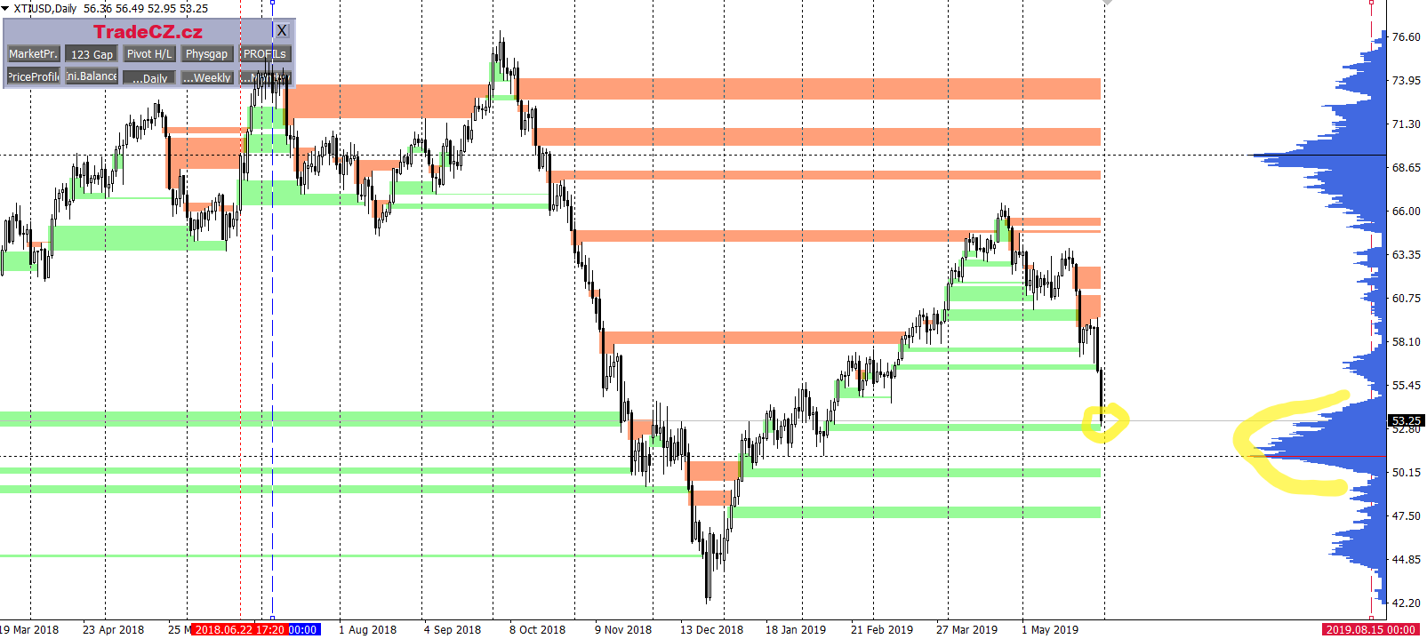 Chytat padající nůž není určitě moudré, ropa se chystá zavřít skrytý longový gap, jako magnet ji přitahuje silný profil okolo hodnoty 52.