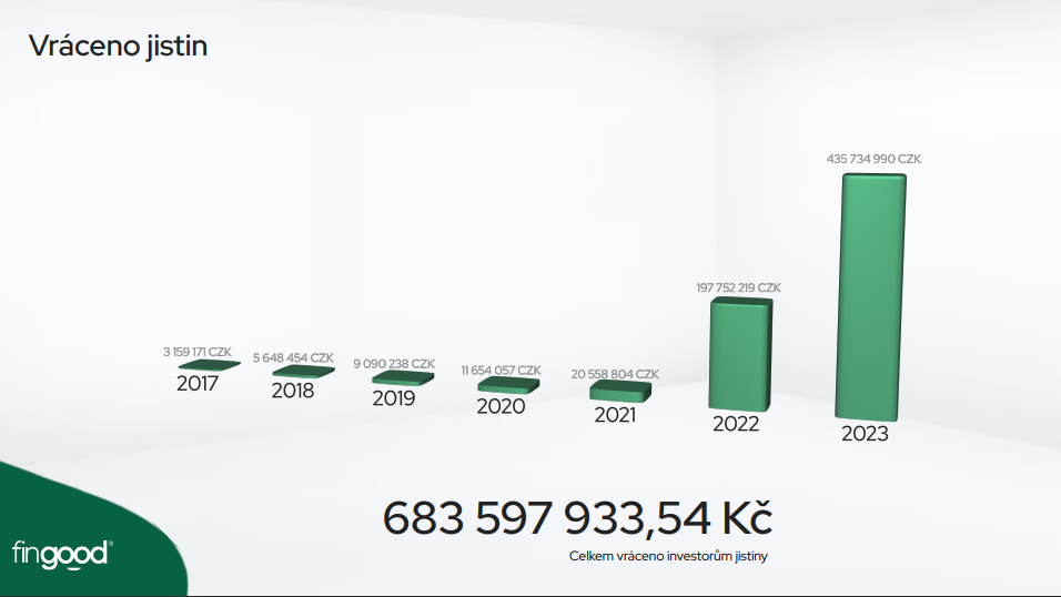 Společnost Fingood vrací investorům jejich investice v rekordním tempu. V roce 2023 vyplatila investorům jistiny ve výši 435 743 990 Kč, což je přibližně o 120 % více než v předchozím roce.