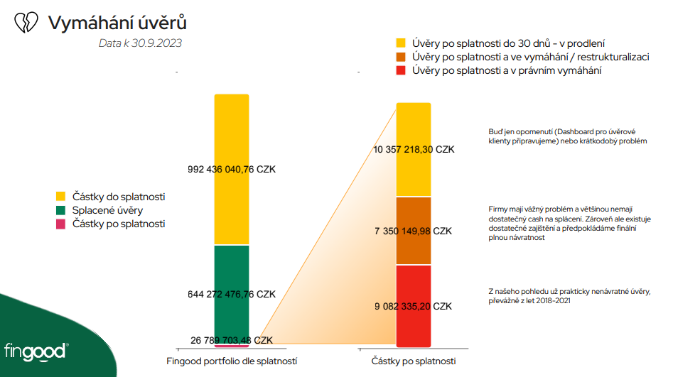 Na obrázku výše můžete vidět graf, který zobrazuje stav vymáhání úvěrů společnosti Fingood k datu 30. září 2023. Graf, a tudíž celé Fingood portfolio je rozděleno do 3 sekcí.