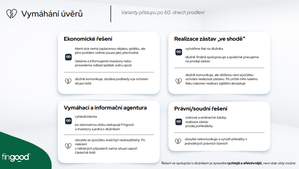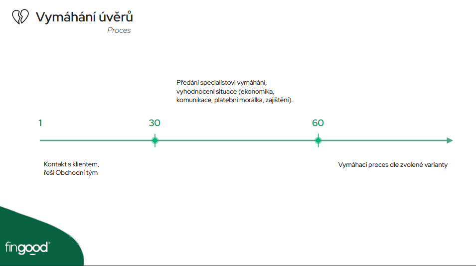 Již po prvním „nesplaceném dnu“ začíná s klientem řešit celou záležitost obchodní tým Fingoodu, který má za cíl zjistit podrobnosti. Tenhle proces je nastaven na 30 dní. Po uplynutí je celý případ předán specialistovi vymáhání, který vyhodnotí celou situaci a bude se ji snažit vyřešit. Pokud ani toto nepomůže, nastupuje vymáhací proces dle zvolené varianty, který bude popsán níže na obrázku.