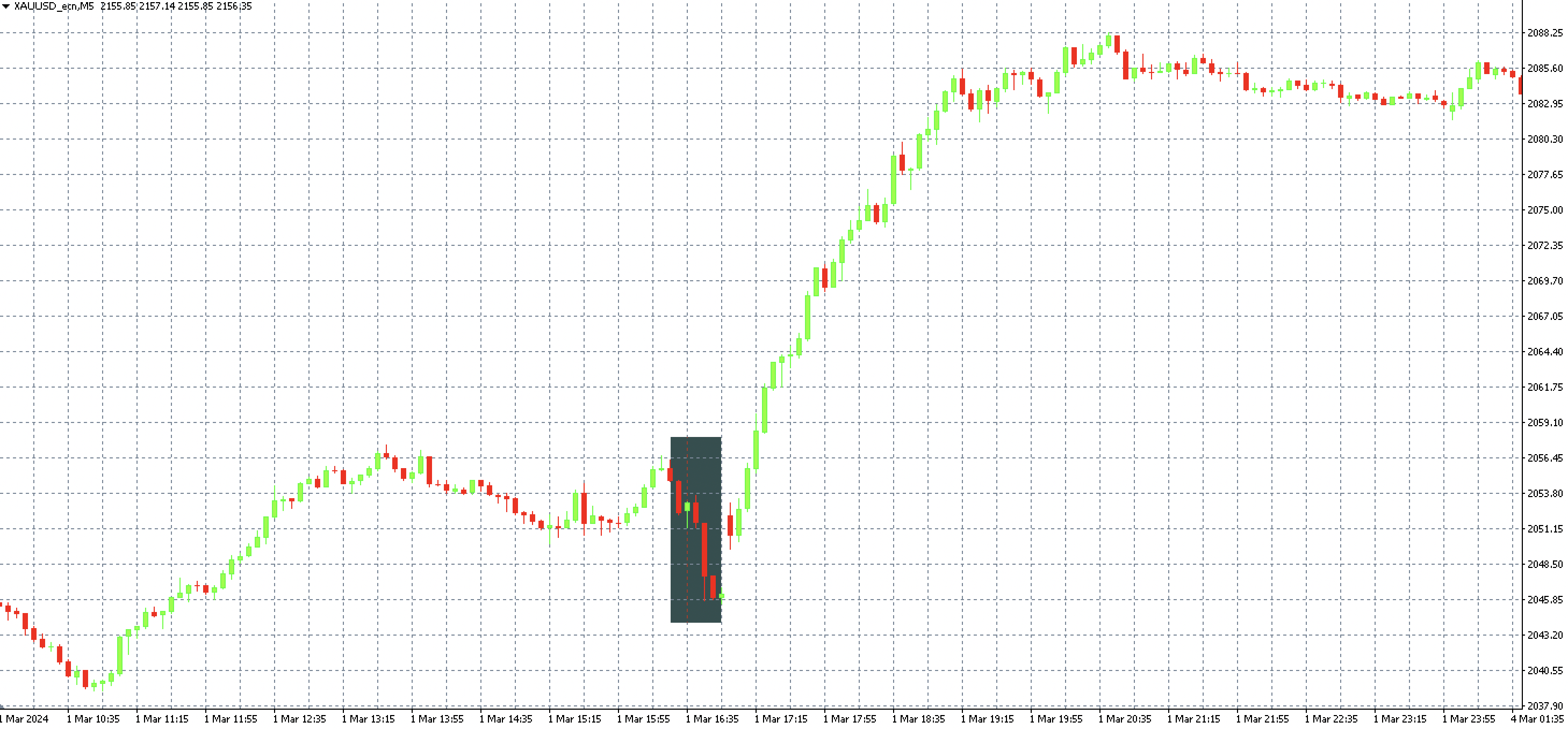 Pojďme si nyní rozebrat jeden z nejziskovějších momentů obchodníka Mariána, ke kterému došlo 1. března. Marián obchoduje na €400 000 ProTrader programu a specializuje se výhradně na intradenní obchodování zlata. V pozicích málokdy zůstává déle než hodinu. Podobně tomu bylo i tentokrát, kdy se velice odvážně rozhodl shortovat zlato, a to hned dvěma několikalotovými pozicemi. Možná se vám to zdá jako bláznovství, jenže Marián sleduje fundamenty a měl něco v plánu…