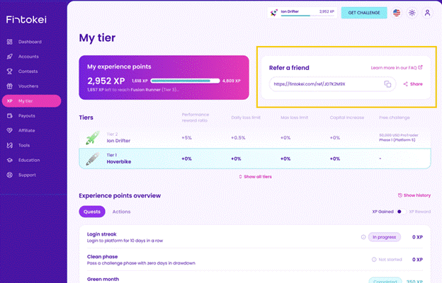 Ve Fintokei jsme spustili novou funkci v rámci našeho Loyalty Programu. Díky systému „Refer a friend“ teď naši tradeři mohou získat výhody nejen pro sebe, ale i pro tradery, které k nám přivedou. Princip je jednoduchý: nasdílet unikátní referral link, nový trader získá slevu na první nákup a oba za to dostanou XP body do Loyalty Programu.