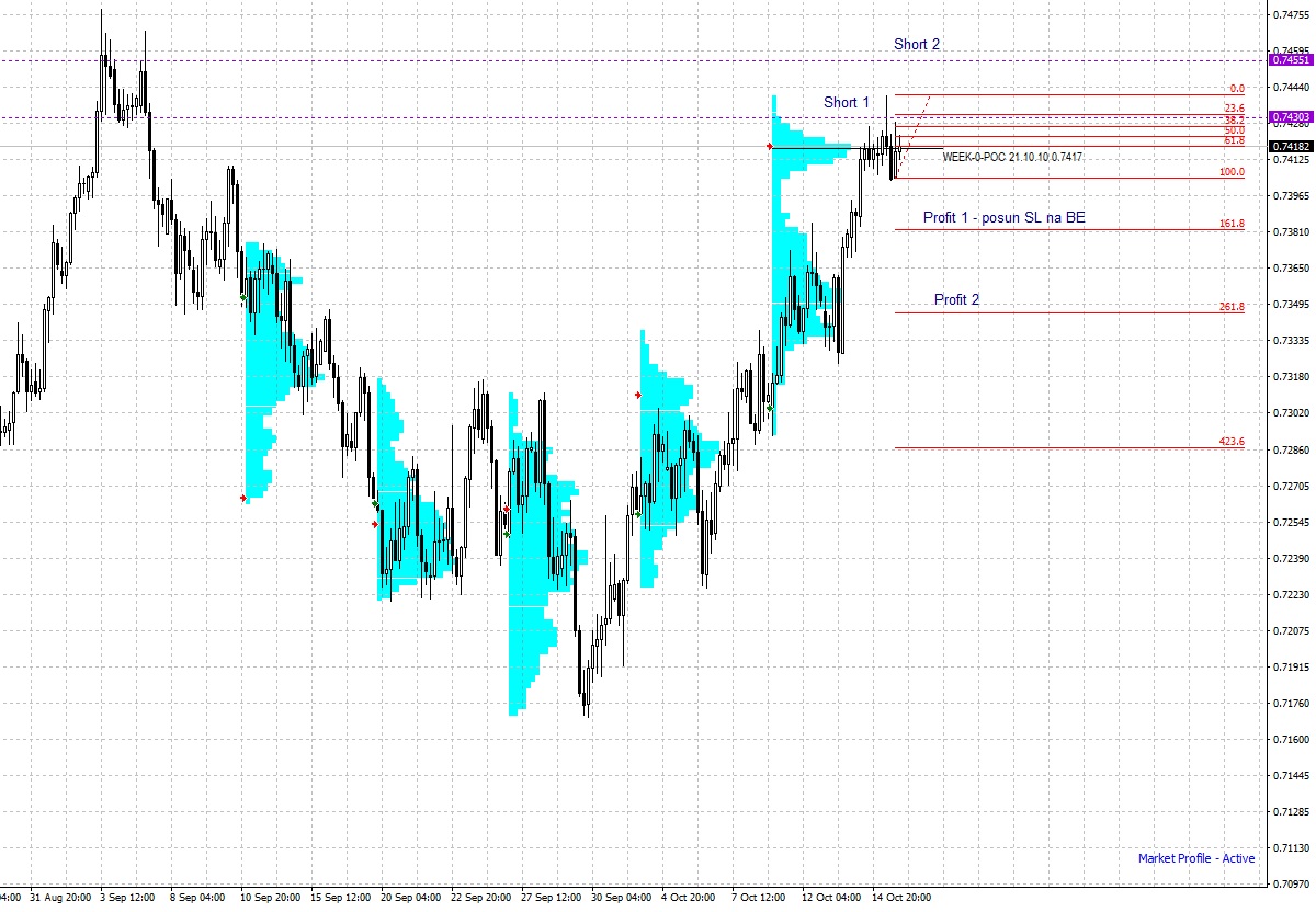 V současné době se nacházíme v otevřené obchodní pozici na měnovém páru AUD/USD, kde jsme vstoupili do short obchodu na první cenové úrovni. Současné i budoucí obchodní nastavení vidíte na obrázku níže. Vzhledem k „rotaci“ pod cenovou úrovní Short 2 již tento vstup považuji za neplatný!