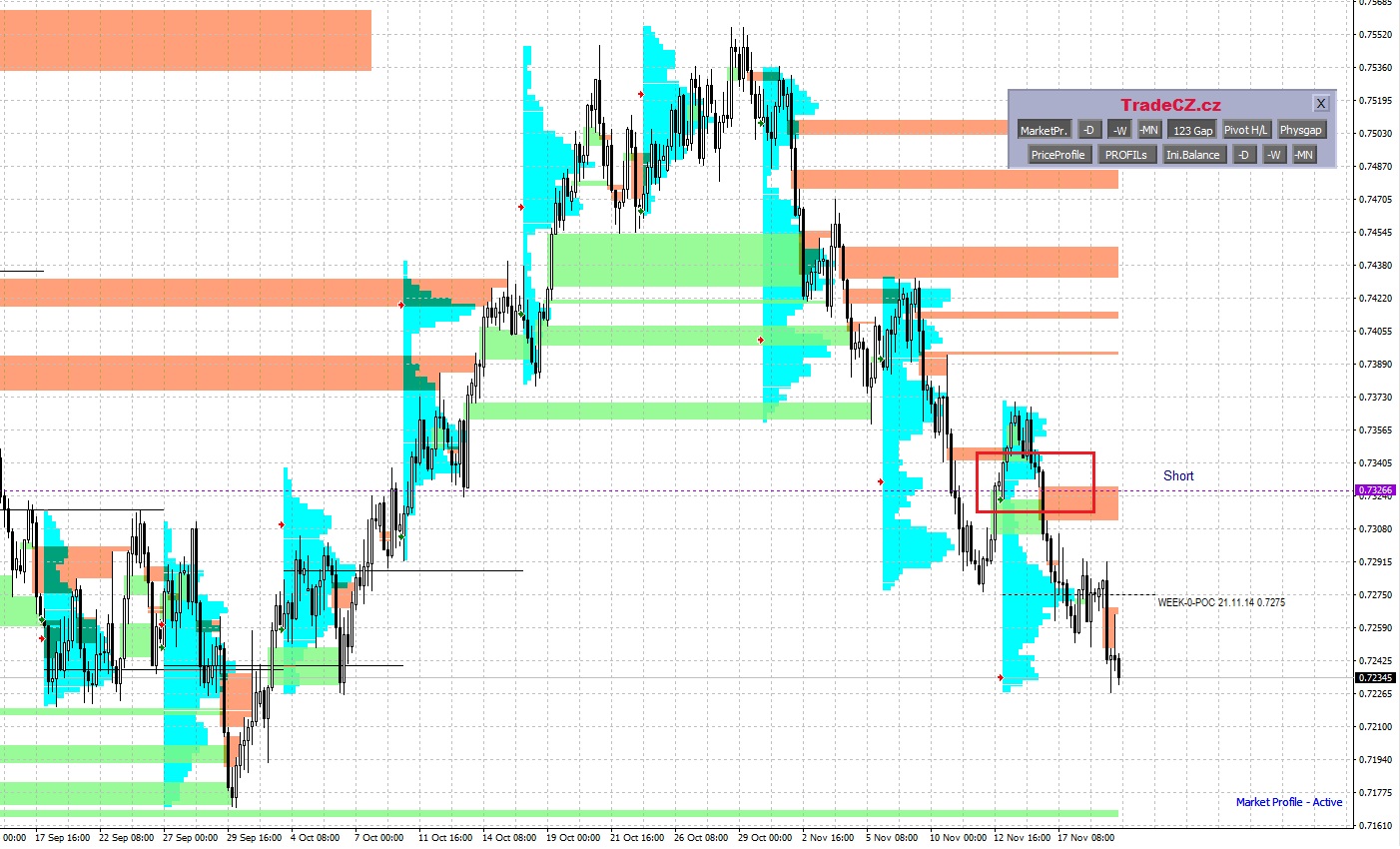 Měnové páry jsou analyzovány pomocí metody Market Profile, která umožňuje v trhu vyhledávat cenové oblasti s největším zájmem obchodníků.