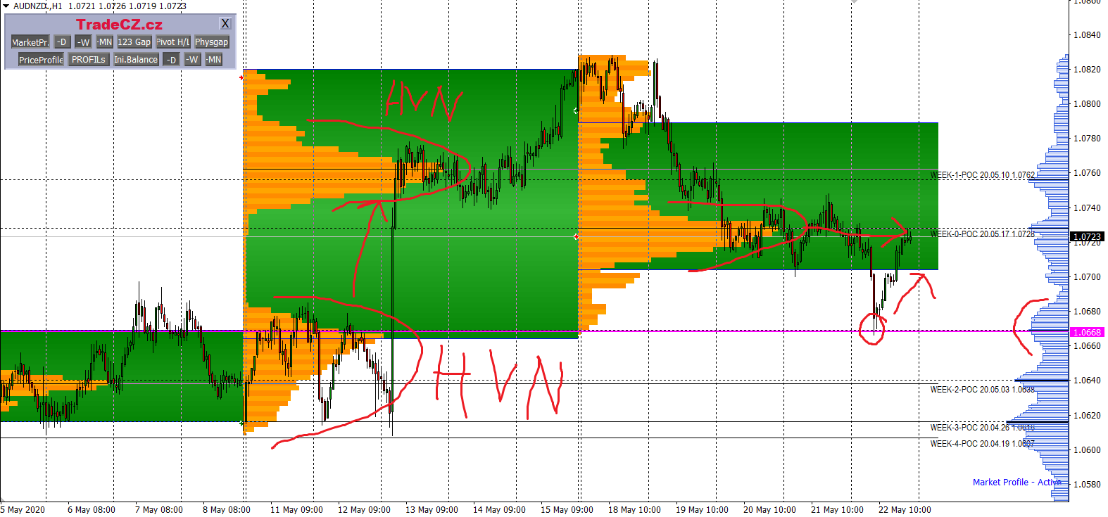 Jednalo se o klasický pattern z obchodní metody Market Profile, a sice retest předchozí oblasti high volume node (HVN) při hledání férové ceny.