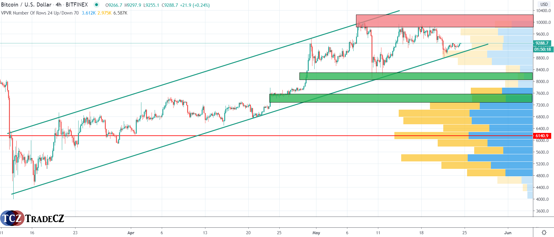 Bitcoin se pohybuje v rostoucím trendovém kanálu a chystá se na další otestování silné resistence. Resistencí je psychologická hodnota a kulaté číslo 10 000 USD. Supporty lze najít díky Volume Profile velmi snadno, v tomto případě by ale spadnutí trhu na první i druhý support znamenalo intraday medvědí náhled.