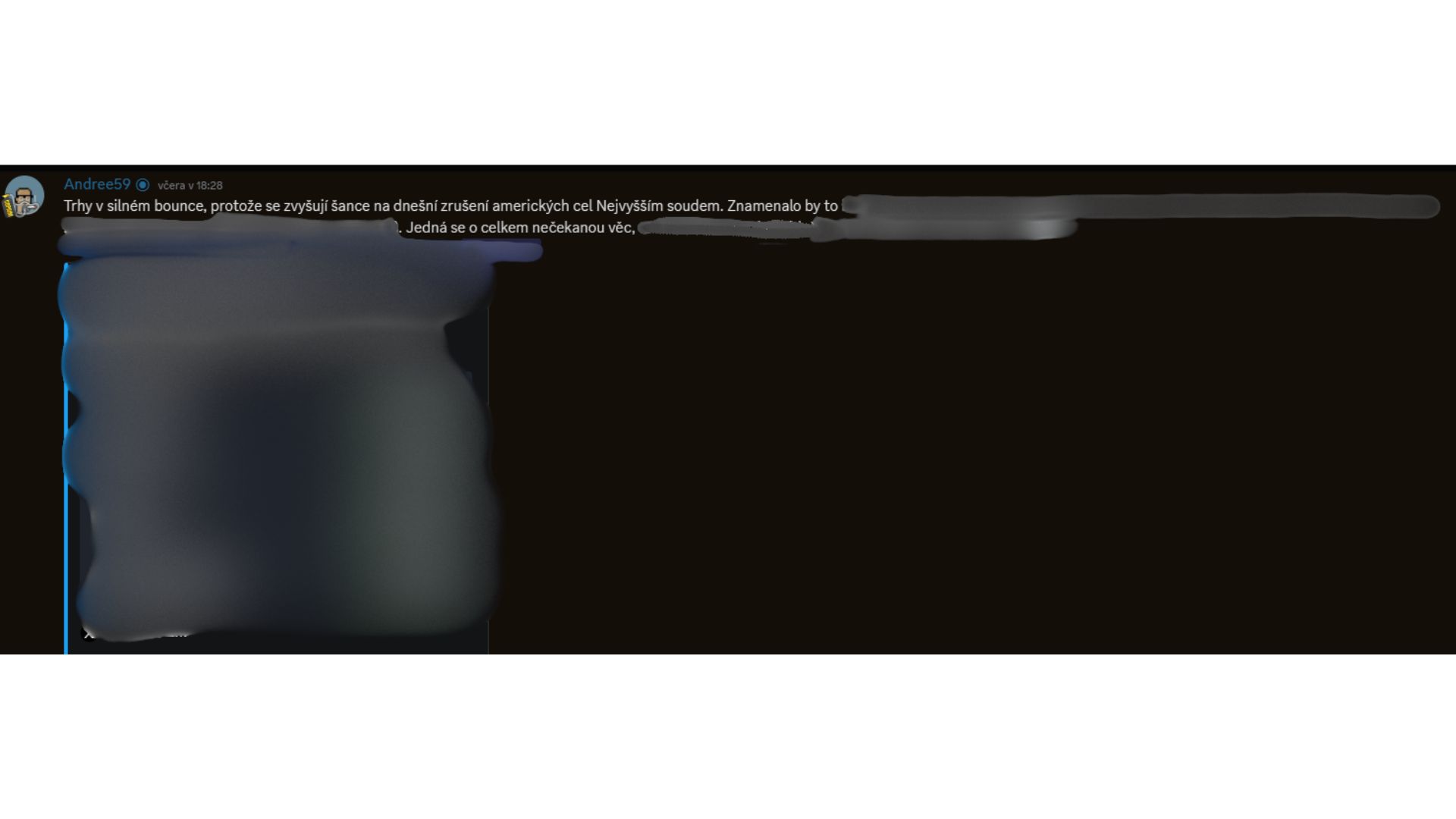 Ve skupině se rovněž rozebíraly makroekonomické faktory ovlivňující kryptotrh – například rostoucí šance na zrušení amerických cel Nejvyšším soudem USA a jejich možný dopad na globální ekonomiku i cenu Bitcoinu.