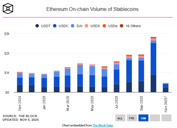 Podle dat z The Block přesáhl on-chain objem stablecoinů na Ethereu hranici 2,82 bilionu dolarů, čímž překonal zářijový rekord 1,94 bilionu. To představuje 45% měsíční růst.