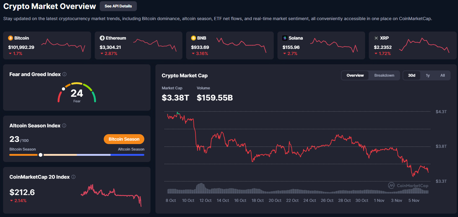 Podle nejnovějšího přehledu (k 6. 11. 2025) je intradenní nálada na hlavních kryptoměnách spíše negativní: Bitcoin se obchoduje na $101,973.89 (−1.64 %), Ethereum na $3,292.56 (−2.99 %), BNB na $930.79 (−3.28 %), Solana na $155.85 (−2.66 %) a XRP na $2.2355 (−1.59 %).