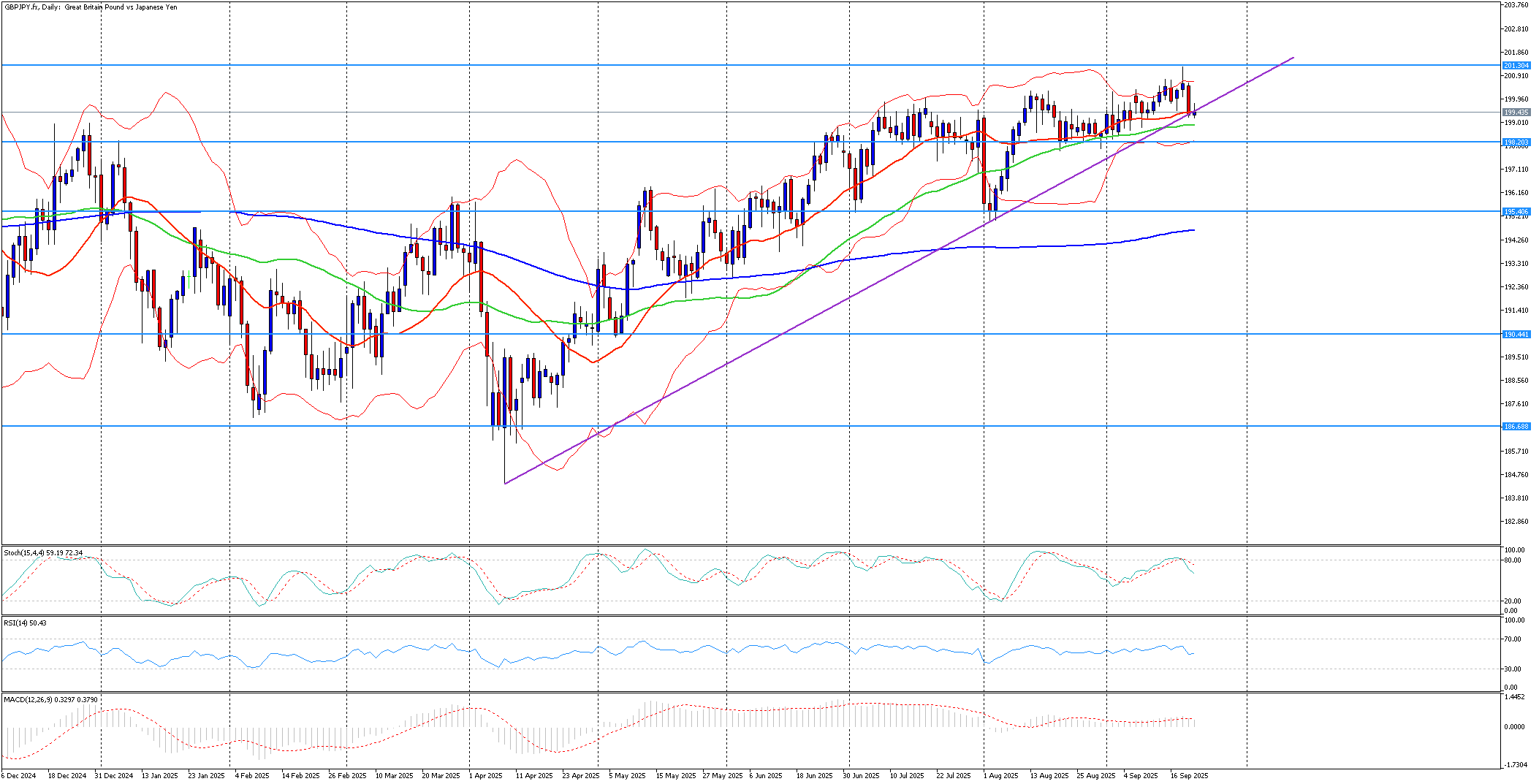 Překvapením však bylo, že dva členové měnového výboru požadovali jejich zvýšení na 0,75 %, což ukazuje na rostoucí napětí uvnitř instituce ohledně další politiky. Dalším významným oznámením bylo rozhodnutí banky odprodat burzovně obchodované fondy v hodnotě 250 miliard USD, což naznačuje snahu o postupné utažení podpůrných programů. Kurz páru reagoval poklesem poté, co krátce předtím vystoupal až na 14měsíční maximum 201,25. Právě zde narazil na bariéru tvořenou vzestupnou trendovou linií z roku 2024. Od té doby se pozornost obchodníků přesouvá k pásmu 198,75–199,75, kde se nachází jak 20denní, tak 50denní klouzavý průměr a zároveň trendová linie z dubna. Průraz pod tuto oblast by mohl otevřít prostor pro pokles k 197,90 a dále až k 197,00. Indikátory momenta přitom naznačují ochlazení růstové dynamiky. RSI i stochastika klesají, což poukazuje na slábnoucí nákupní tlak, avšak RSI zůstává nad úrovní 50. To dává býkům prostor k případné konsolidaci a dalšímu útoku. Do obrazu navíc vstupuje Bollingerovo pásmo, které se začíná zužovat a signalizuje blížící se nárůst volatility. Pokud by se kupci dokázali udržet nad úrovní 199,75, mohl by pár znovu otestovat 201,00 a posléze směřovat k 203,00. V případě silnějšího býčího zájmu připadá v úvahu i růst k výrazné rezistenci na 204,30. Přestože se krátkodobě projevuje prodejní tlak, udržení oblasti 198,90–199,35 by nadále podporovalo konstruktivní a býčí nastavení trendu.