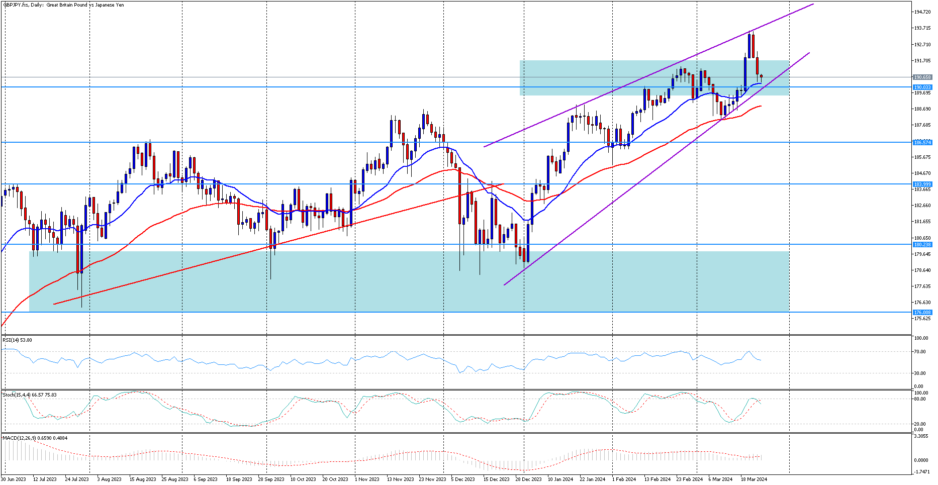 GBP/JPY po odražení od osmi a půlletého maxima 193,55 ustupuje a pohybuje se směrem ke krátkodobé vzestupné trendové linii.