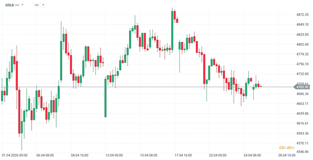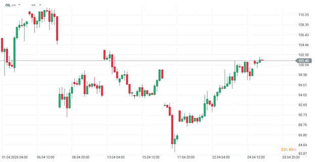 Brent se 27. dubna obchoduje na úrovni 101,5 USD/barel (OIL CFD na platformě xStation5), WTI kolem 96,5 USD/barel. Globální zásoby se čerpají rekordním tempem a Goldman Sachs zvýšil výhled cen ropy Brent na konci roku na 90 USD/barel, přičemž upozornil, že obnovení toků přes Hormuz nastane podle jejich odhadů nejdříve koncem června.
