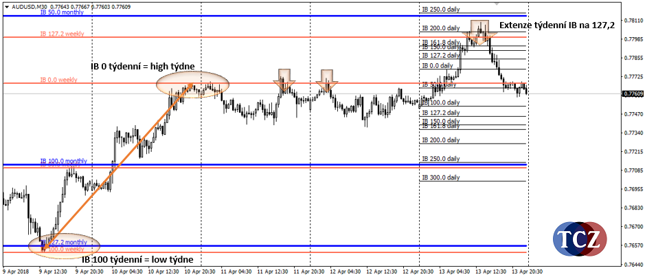 Na obrázku výše máme zvýrazněnou týdenní počáteční rovnováhu, tvořenou high a low týdne (pondělí a úterý). Ve středu a ve čtvrtek přišly dvě reakce na high týdne, aby v pátek trh zareagoval na úroveň IB 127,2.