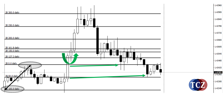 Hladina 50 % z IB je jedna z nejsilnějších pro denní IB, a to především, pokud je velikost denní IB větší než obvykle (u EURUSD cca 25 pipů). Určitě není na škodu, pokud trh od dané oblasti trochu odjede a 50 % z IB se stane oblastí pro solidní reakci trhu.