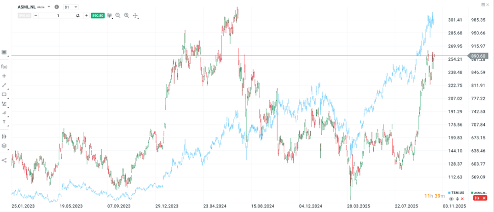 Tyto dvě firmy – ASML a TSMC – jsou pro současný rozmach umělé inteligence naprosto klíčové, protože nikdo jiný než ASML nedokáže vyrobit takto pokročilé stroje a nikdo kromě TSMC neumí pomocí těchto zařízení vyrábět samotné čipy.