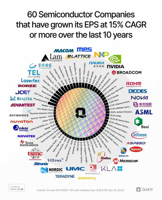 Mnoho čipových firem v průběhu poslední dekády zvyšovalo své zisky na akcii (EPS) o více než 15 % ročně. Seznam těchto společností spolu s průměrným ročním růstem EPS můžete vidět na obrázku níže.
