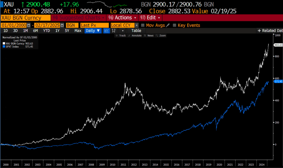 Pokud se podíváme na jiná tradiční aktiva, zjistíme překvapivě, že se zlatu v daném období paradoxně dařilo lépe než akciím. Od roku 2000 totiž vzrostlo o 904 %, což odpovídá ročnímu růstu o přibližně 9,6 %. Na grafu je zlato znázorněno bílou barvou a index S&P 500 modrou.