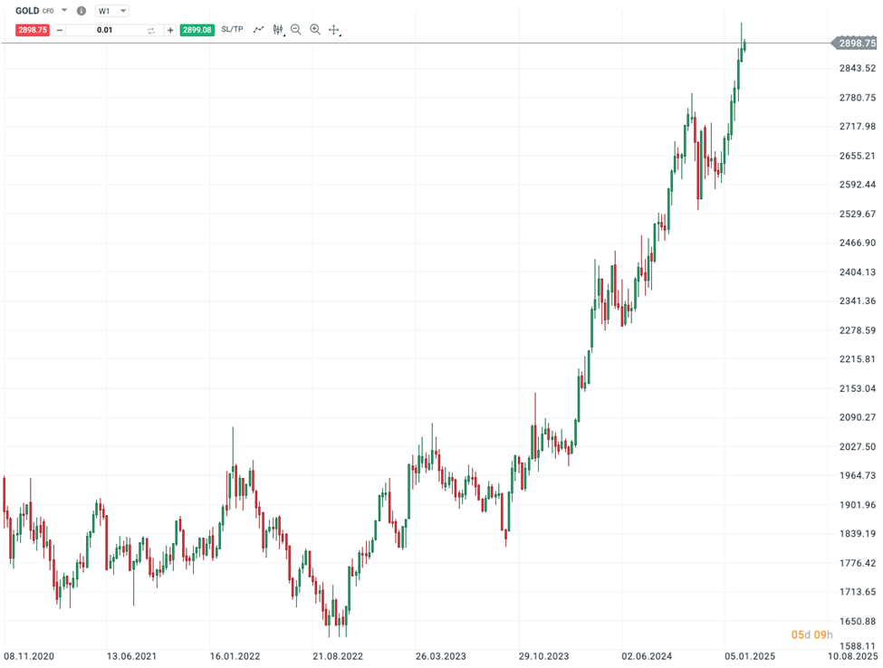 Analytici očekávají pro rok 2025 pokračující růst ceny zlata, i když mírnějším tempem než v předchozím roce, kdy zlato vzrostlo o více než 20 % a v růstu pokračuje i letos. V současné době se ceny zlata nacházejí na historických maximech.
