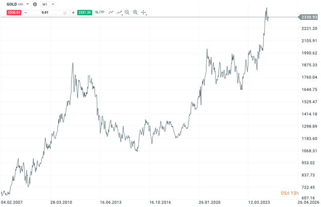 V posledních měsících zažívá zlato skutečně volatilní období. Jeho cena se aktuálně drží nad 2 000 USD, což je asi 4-5 % pod historickými maximy z minulého měsíce. Po dlouhé stagnaci je nejznámější drahý kov opět v centru zájmu mnoha investorů. Není divu, když zlato za poslední roky zaznamenalo významný růst, od lokálních minim v roce 2022 vzrostlo o více než 40 %. Je ale otázkou, zda cena bude dále růst.
