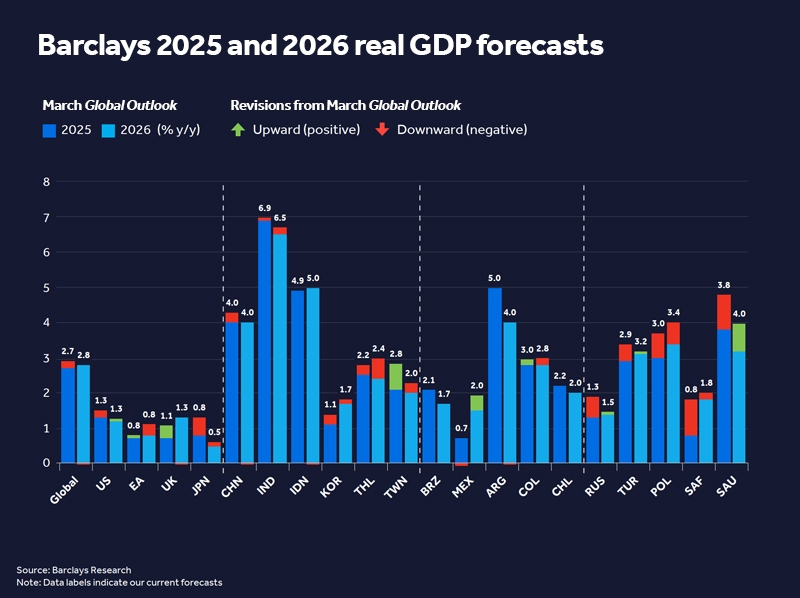Celkově analytici Barclays revidovali svou prognózu globálního ekonomického růstu pro letošní rok. Nově očekávají pokles na 2,7 %, což je o 0,2 procentního bodu méně, než bylo předpovídáno v březnu. Toto zpomalení je důsledkem kombinace výše zmíněných faktorů, včetně amerických cel a nestability čínského realitního trhu.
