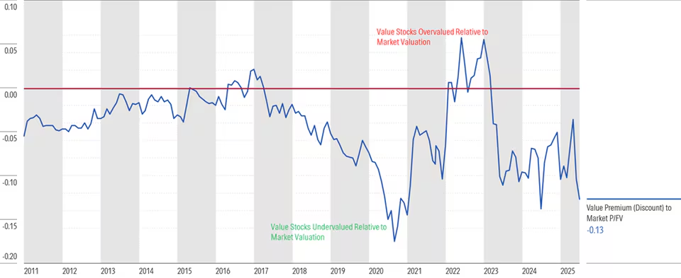 Hodnotové akcie se i nadále obchodují s výraznou slevou | Morningstar Research Services, LLC. Data as June 30, 2025