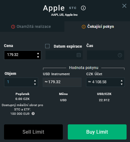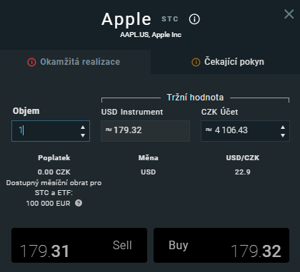 Po rozkliknutí se nám zobrazí okno, ve kterém si můžeme zvolit, zda nakoupíme akcii okamžitě, nebo zda zadáme limitní pokyn. V případě okamžité objednávky (při otevřeném trhu) si zvolíme počet kusů akcií a ihned vidíme, kolik budeme muset zaplatit.