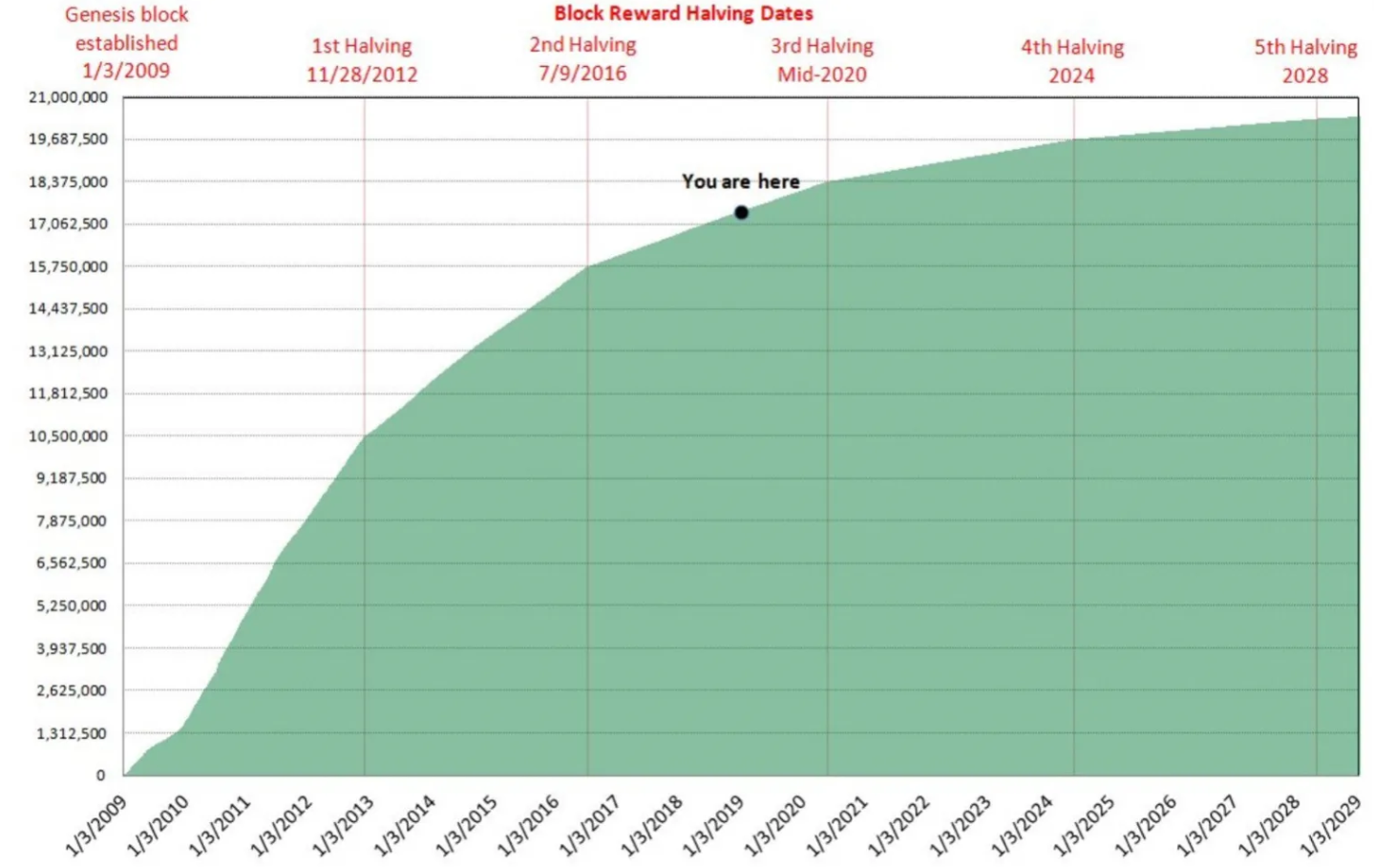 Zajímavostí je, že z maximálních 21 milionů mincí už je na světě 19,5 milionu. Nové se tak generují oproti předešlému desetiletí mnohokrát pomaleji, což má zřejmý dopad na trh, neboť to ponižuje dostupnou nabídku. Rychlost těžby se bude i nadále každé čtyři roky zpomalovat, až v roce 2140 ustane úplně. Více se o halvingu dočtete zde.