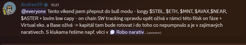 Lukáš Hlobil z KryptoVIP opět zveřejnil nový update ze skupiny. Tento víkend se nesl ve znamení bull run módu – Lukáš šel long na přední kryptoměny, jako jsou ETH, STBL, MNT, AVAX, NEAR či ASTER.