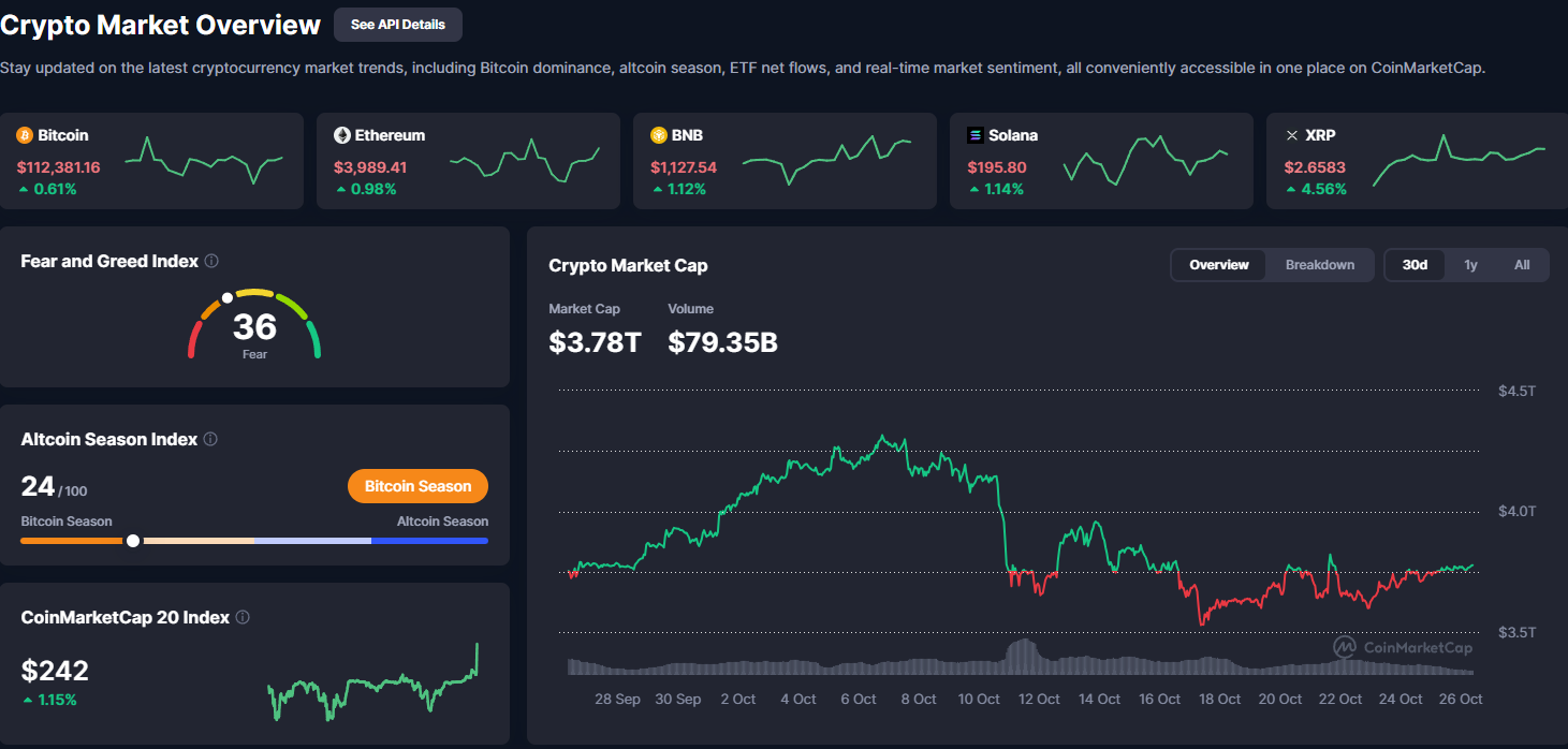 Při pohledu na CoinMarketCap ke dni 26. 10. 2025 je vidět mírně pozitivní intradenní nálada hlavních kryptoměn — Bitcoin je zobrazován na hodnotě $112,381.16 (+0.61 %), Ethereum $3,989.41 (+0.98 %), BNB $1,127.54 (+1.12 %), Solana $195.80 (+1.14 %) a XRP $2.6583 (+4.56 %).