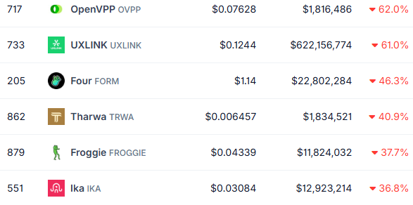 Mezi kryptoměny s největšími ztrátami se zařadily například tokeny čelící vážným bezpečnostním problémům, projekty, u nichž se spekuluje o možném omezení prodeje ze strany samotného autora, ale i milionový meme coin Froggie, který zatím zaznamenává výraznou korekci.