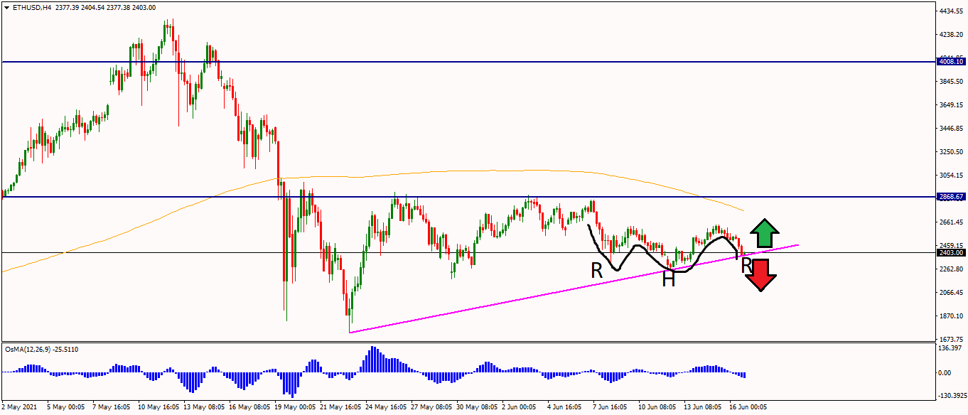 Ethereum padlo z ceny $4 300 až na $1 700 tiež len behom 2 týždňov. To je cca – 60 %! Veľmi silný pád na také krátke časové obdobie. ETH sa ale pomaly zdvíha a robí vyššie low a tvorí formáciu trojuholník, v ktorej sa takisto tvorí formácia obrátená hlava ramena.