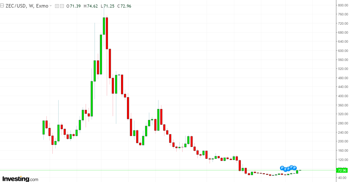 Zcash se od své nejvyšší popularity svezl z hodnot kolem 800 USD až na pouhých 50 USD. Na 50 USD našel své prozatímní dno a z aktuální hodnoty 70 USD míří na rozhodující resistenci 110 USD.