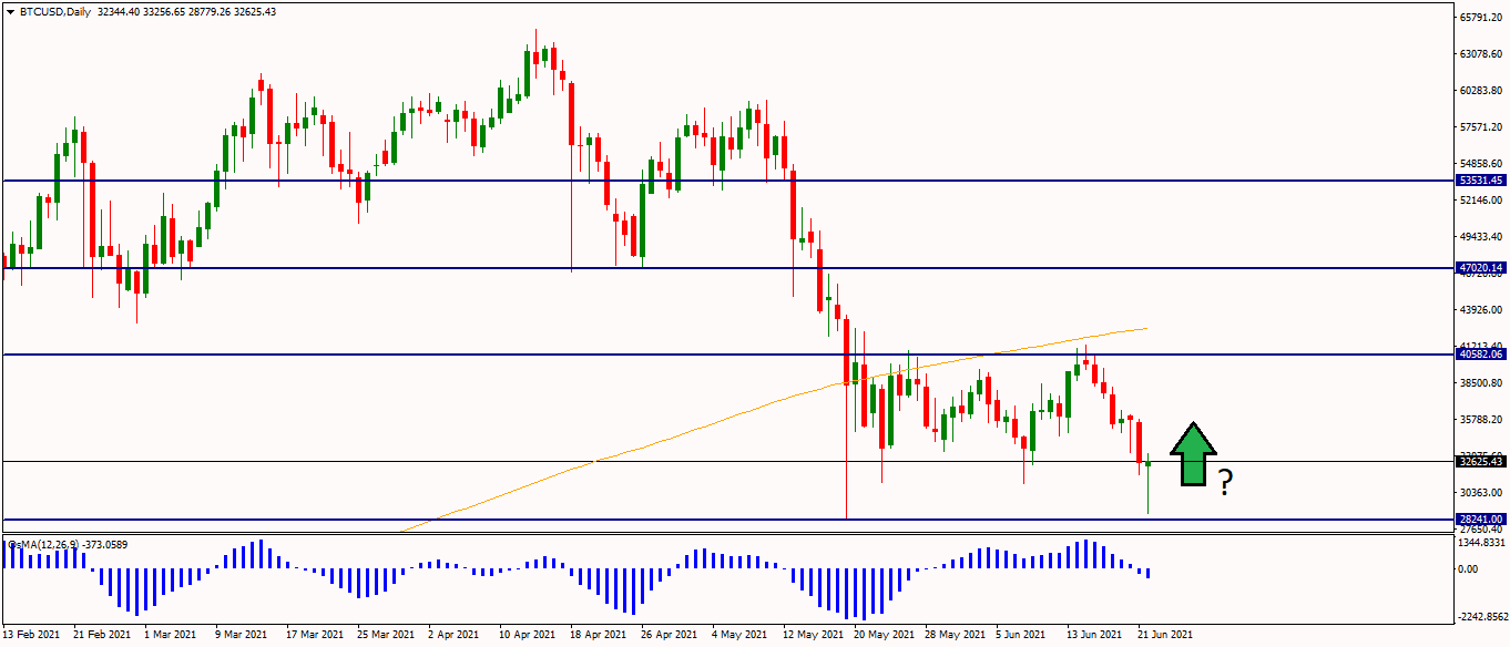 Na grafu sa vytvára pin bar, ktorý keď sa uzavrie by mohol naštartovať ďalší rast aspoň na hornú časť stranovky cena $40k. Ak by sa BTC podarilo prekonať level $40k, tak by mal dôjsť aspoň k cene $47k alebo $53.5k. Pri prekonaní aj týchto levelov je veľmi pravepodobný ďalší a asi posledný bullrun až na cenu $100k. Ak ale trh neudrží tento support (cena $28k), čaká nás ďalší pokles.