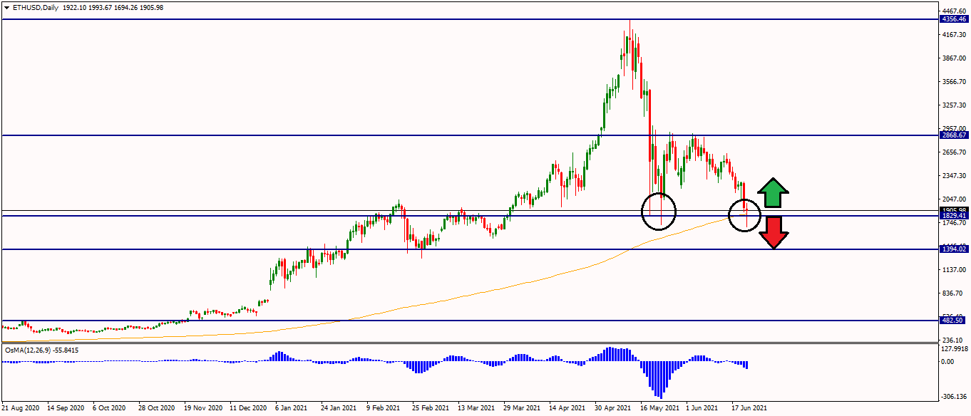Podľa BTC sa riadia v podstate všetky kryptomeny, takže Ëthereum je v podobnej situácii ako BTC. Po veľkom páde sa trh zastavil na cene $1 700, šiel hore a teraz znova testuje tento support, kde by mohlo vzniknúť dvojité dno a rast by mohol pokračovať, pretože tentokrát sa ETH dokonca odrazilo od kĺzavého priemeru (SMA200).