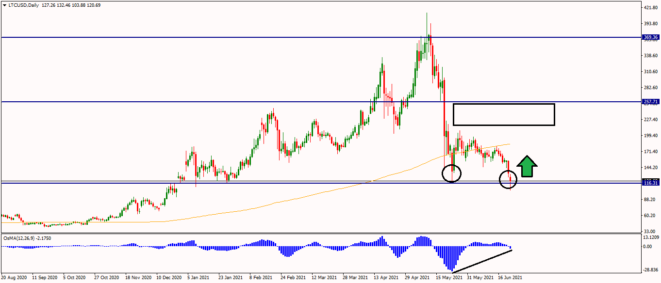Litecoin si prešiel najväčším pádom až na cenu cca $116 a nachvíľu to vyzeralo tak, že príde breakout tohto supportu, no nakoniec to vyzerá na falsebreak keďže sa cena vracia tesne po tom čo nachvíľu prekonala support a vzniká tam pin bar na daily grafe. Keďže toto low je nižšie ako to z mája, tak sa dá povedať, že tu vzniká pekná divergencia a mohol by nachvíľu trh rásť.