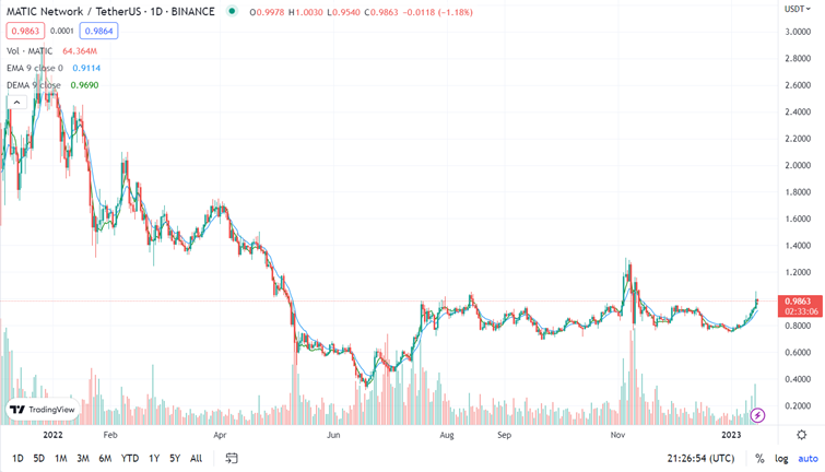 Cena tokenu MATIC v období od prosince 2021 do ledna 2023. Zdroj: TradingView