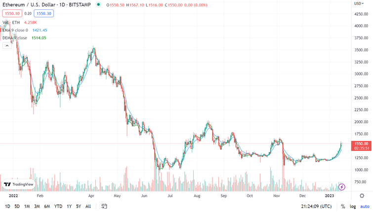 Graf vývoje ceny ETH od ledna 2022 do ledna 2023. Zdroj: TradingView