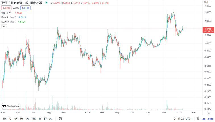 Graf vývoje ceny TWT od února 2021 do ledna 2023. Zdroj: TradingView